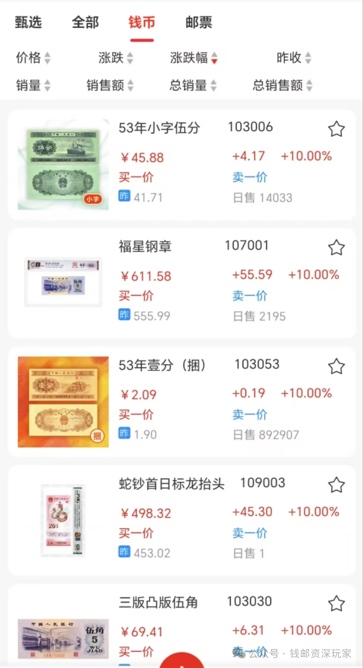 上周最亮眼表现也是最受资金热捧的为钱币5大超级龙头:《龙年纪念币(盒)》、《53年小字伍分》《18K壹分纸币》《53年壹分(刀)》《无油壹分(麻)》《53年一分(捆)》,以及邮票的《抗战70周年型张》和《挥扇仕女图型张》都是交易非常活跃的品种,每天可进可出,带动整个钱库行情都火爆了起来。
