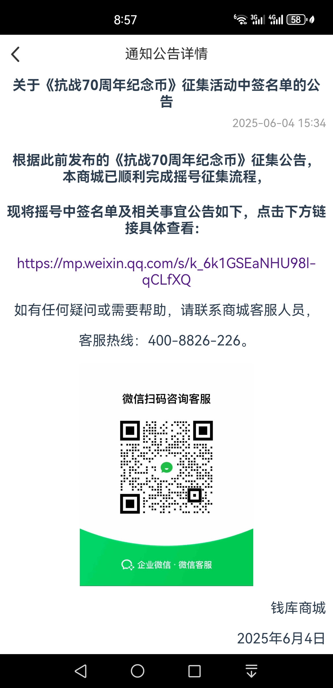 钱库商城根据此前发布的《抗战70周年纪念币》征集公告,本商城已顺利完成摇号征集流程,