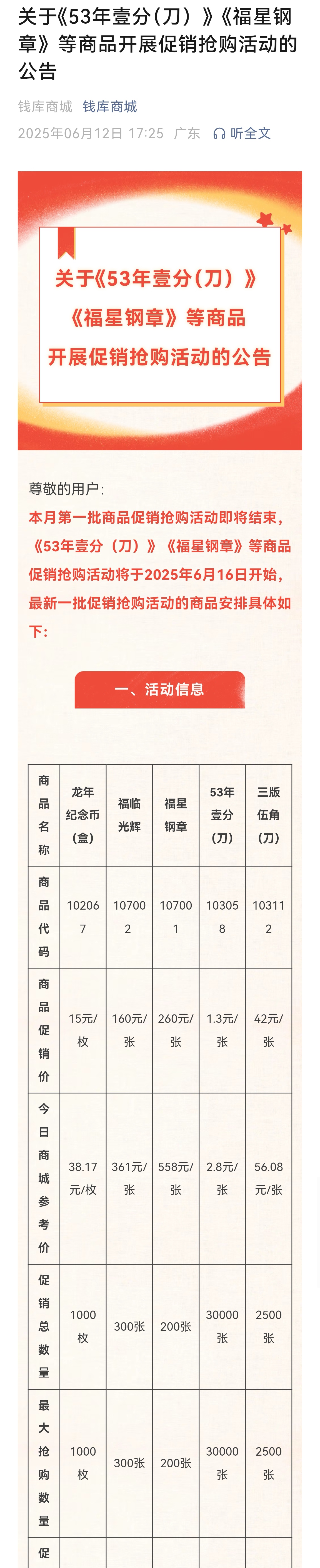 钱库商城关于《53年壹分(刀)》《福星钢章》等商品开展促销抢购活动的公告